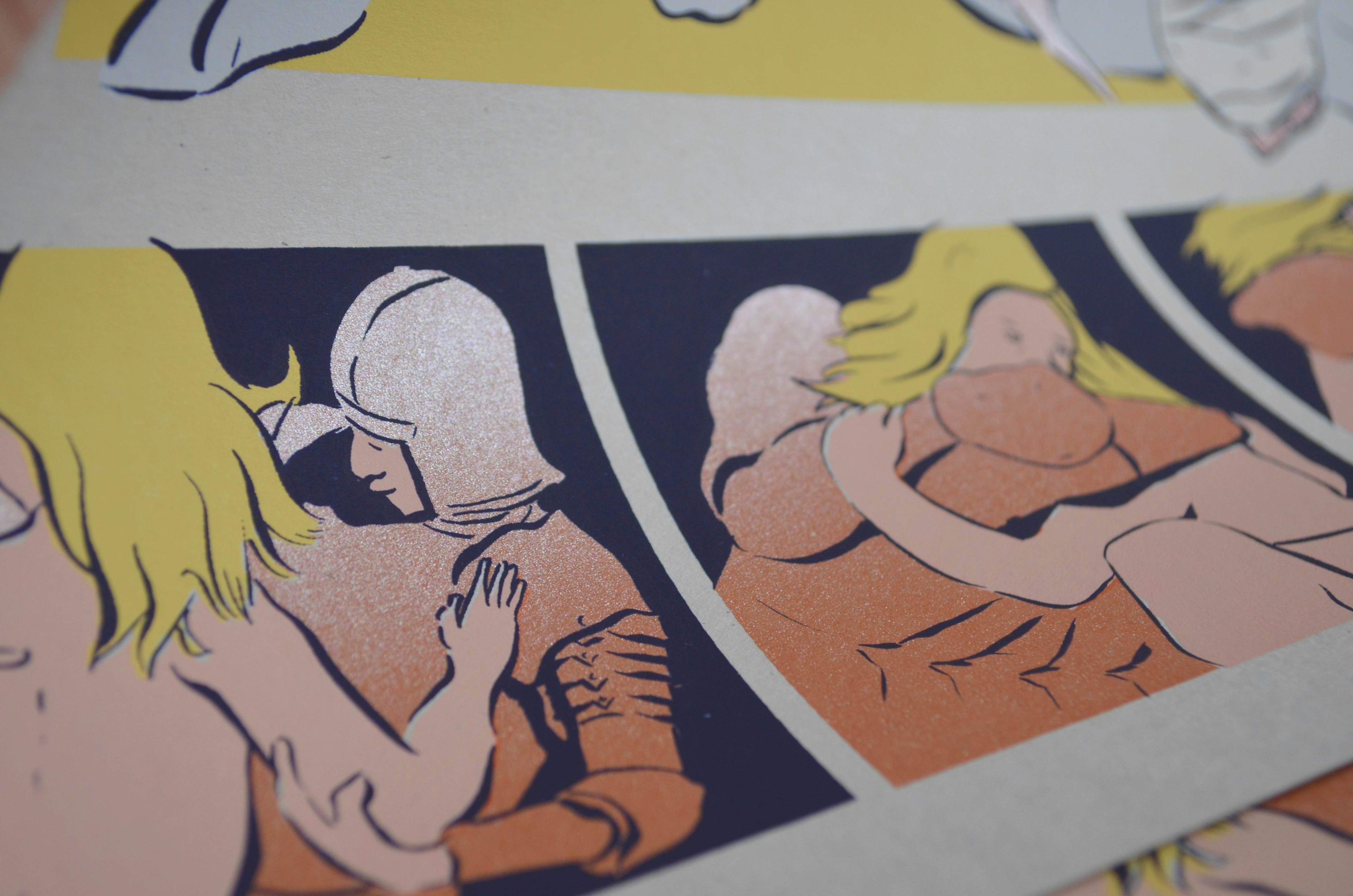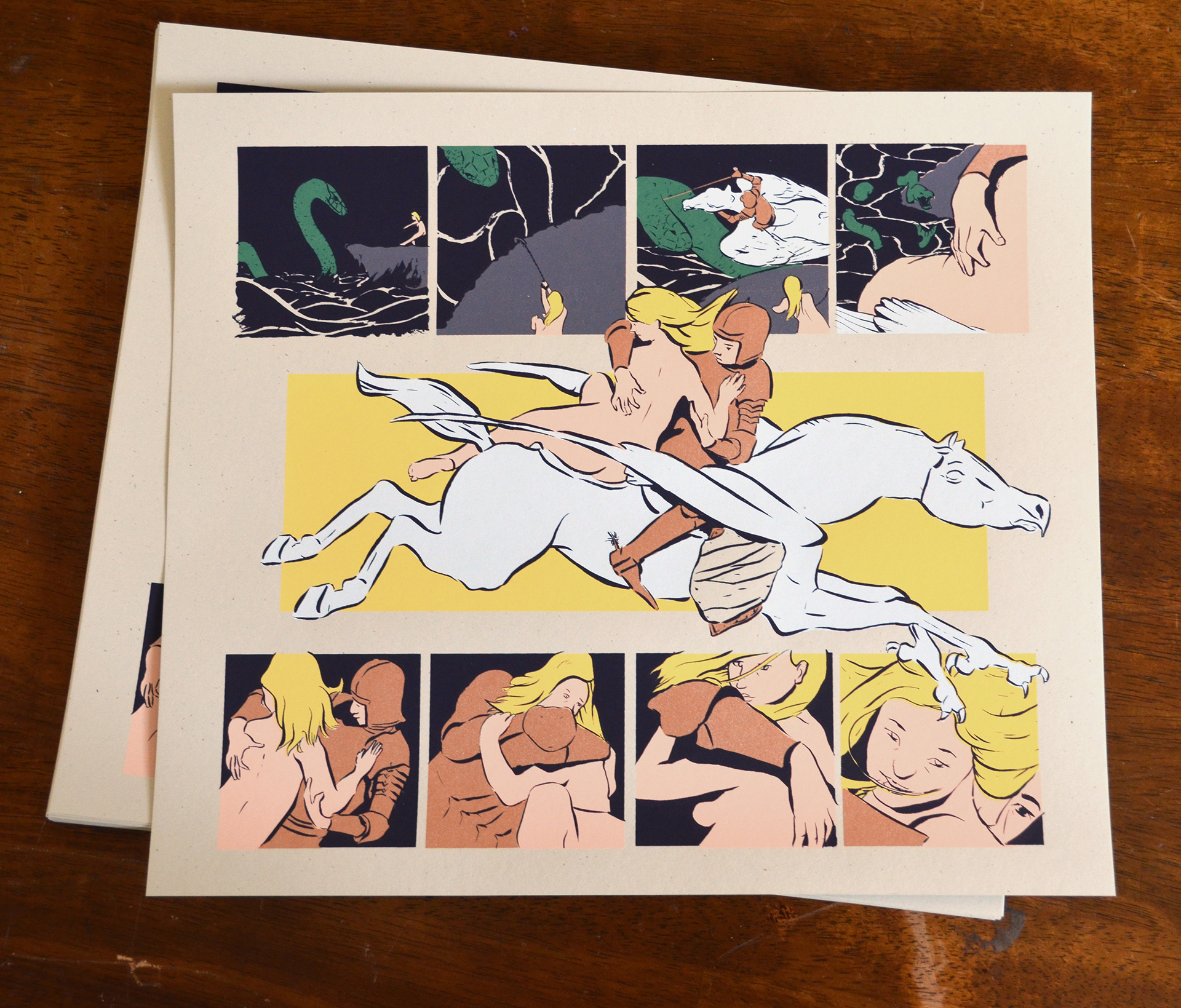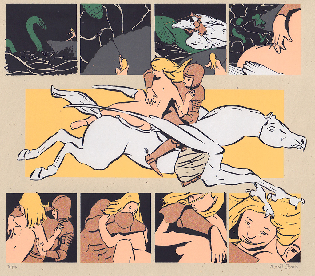 From Ludovico Ariosto's 16th Century Epic Poem "Orlando Furioso" Inspired by Antoine-Louis Barye's Sculpture of the scene 7 color screen print on #80 Old Green Speckletone. Signed and numbered edition of 56. Premiered at SPX 2015 in Bethesda, MD.